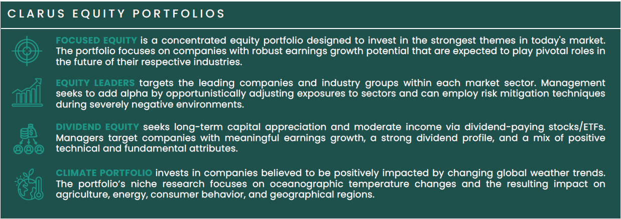 Clarus’ Equity Selection Strategies are a series of actively managed, individual stock portfolios utilizing distinct equity selection methodologies designed to appeal to a wide variety of investors.