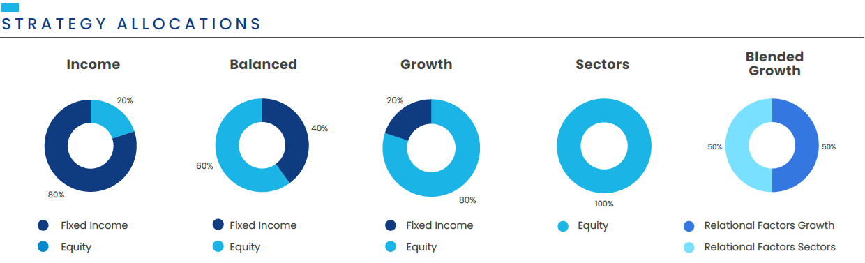In addition to risk-targeted Income, Balanced, and Growth portfolios, the Relational Factors approach also incorporates a sector-focused methodology which aims to capture alpha by taking advantage of relative valuations between sectors. We also offer a blended option, combining both Growth and Sectors at an even split.